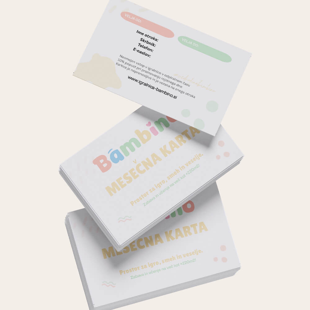 Mesečna karta Bambino je namenjena otrokom, ki igralnico res obožujejo. Omogoča popolno svobodo obiskov – otrok lahko pride v igralnico kadarkoli v času obratovanja, brez omejitve števila obiskov, tudi večkrat na dan.